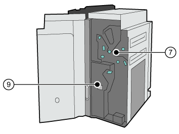 Jednotka pro sešívání ve hřbetu umožňující přístup k oblasti, kde lze vyměnit zásobníky svorek, odstranit vzpříčený papír nebo uvízlou svorku v jednotce pro sešívání ve hřbetu |