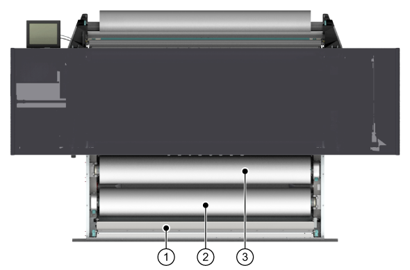 Pode abrir a gaveta de material no lado de entrada do material para carregar os rolos de material.