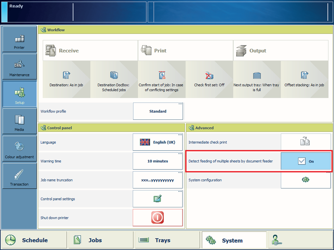 Bruk alternativet [Registrer mating av flere ark fra dokumentmateren] for å slå av registrering.