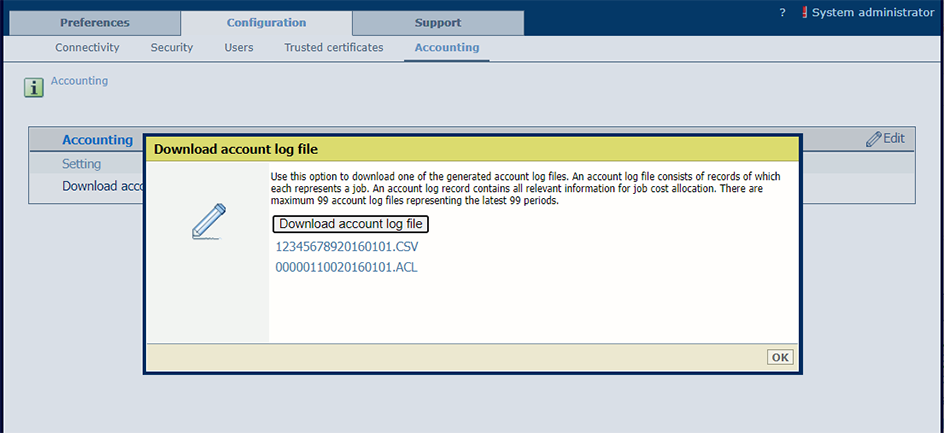 Может существовать несколько неактивных файлов журналов учетных записей (.CSV). Неактивные файлы журнала учетных записей - это завершенные файлы. Может существовать до 99 неактивных файлов журналов учетных записей. При добавлении последующих файлов самые старые файлы удаляются.