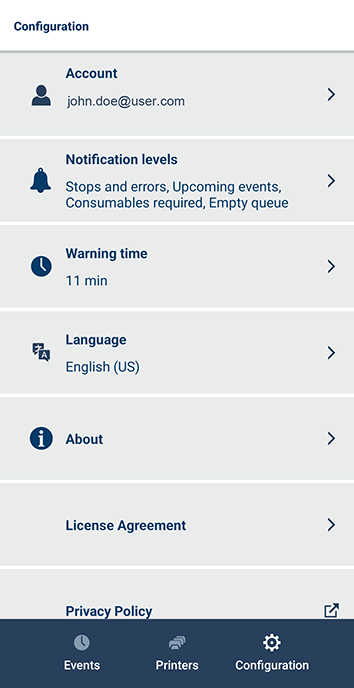 Ecrã de informações de contaExibe o ecrã de definições de notificação do smartphone. As definições disponíveis e o método de configuração variam de acordo com o sistema operativo do smartphone.