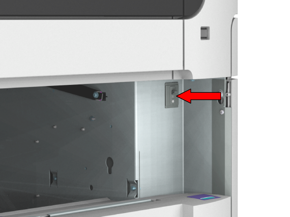 Ügyeljen arra, hogy teljesen kihúzza a fiókot, hogy láthassa a nyomtató belsejének hátulját. A hátlap jobb oldalán látható az áramköri megszakító kapcsolója.