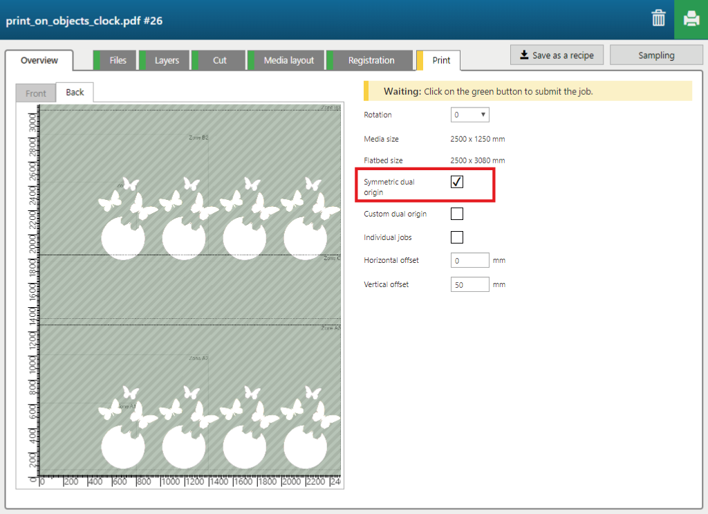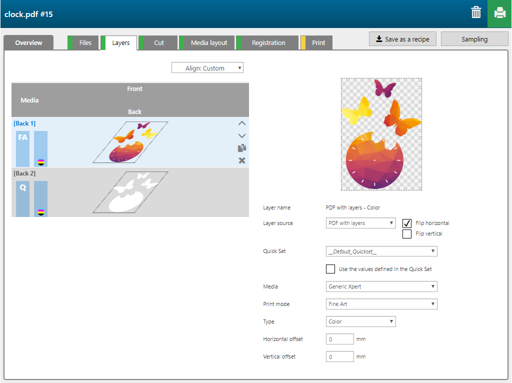 The 'Print on objects' recipe contains 2 layers, printed on the back side of the media.