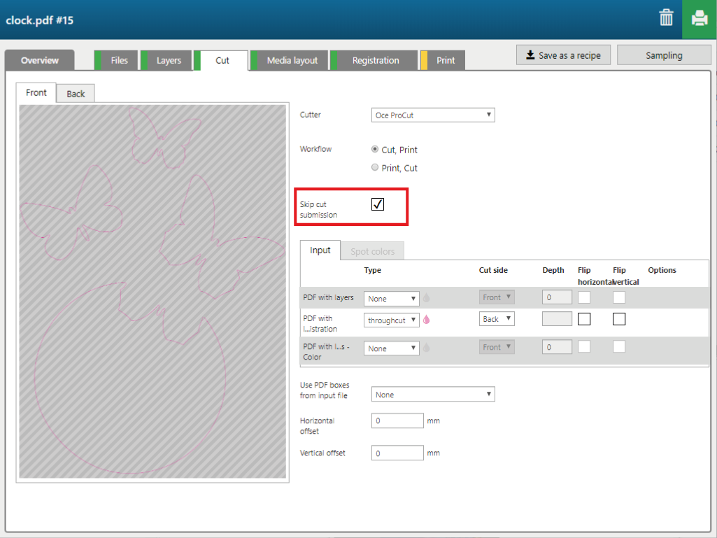 For this application we use pre-cut pieces, so the checkbox [Skip cut submission] is ticked.