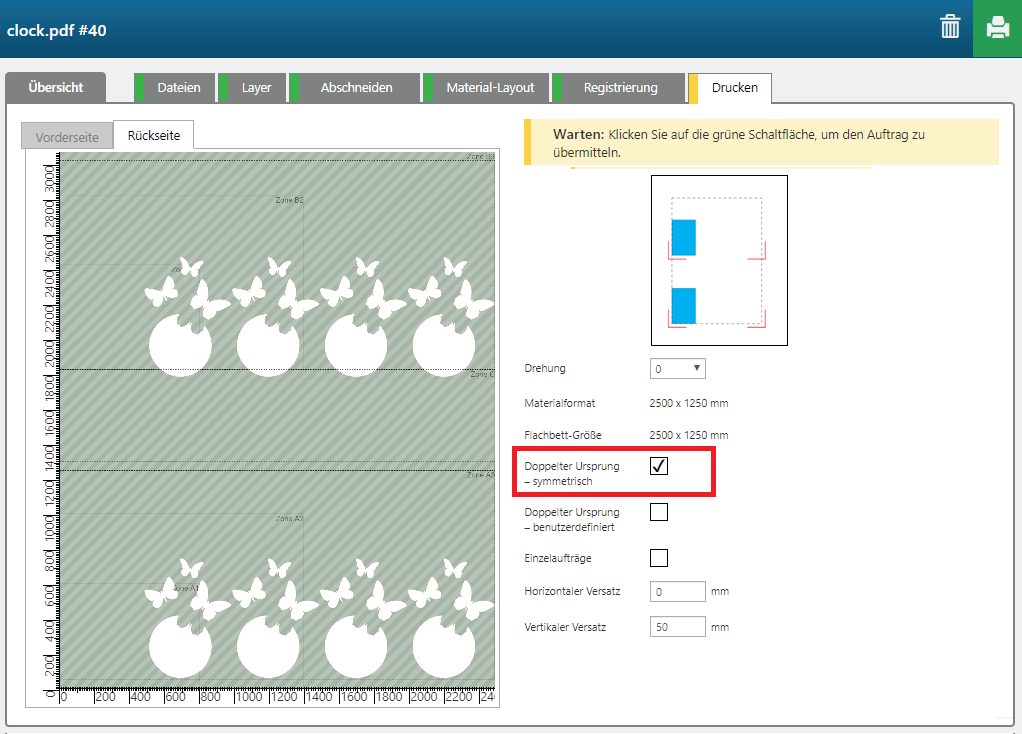 Wenn Sie mehrere Druckträger bedrucken möchten, können Sie die Option [Doppelter Ursprung – symmetrisch] verwenden. Diese Option ermöglicht es, Objekte auf einer Seite des Tisches zu positionieren, während gerade Objekte auf der anderen Seite des Tisches bedruckt werden.