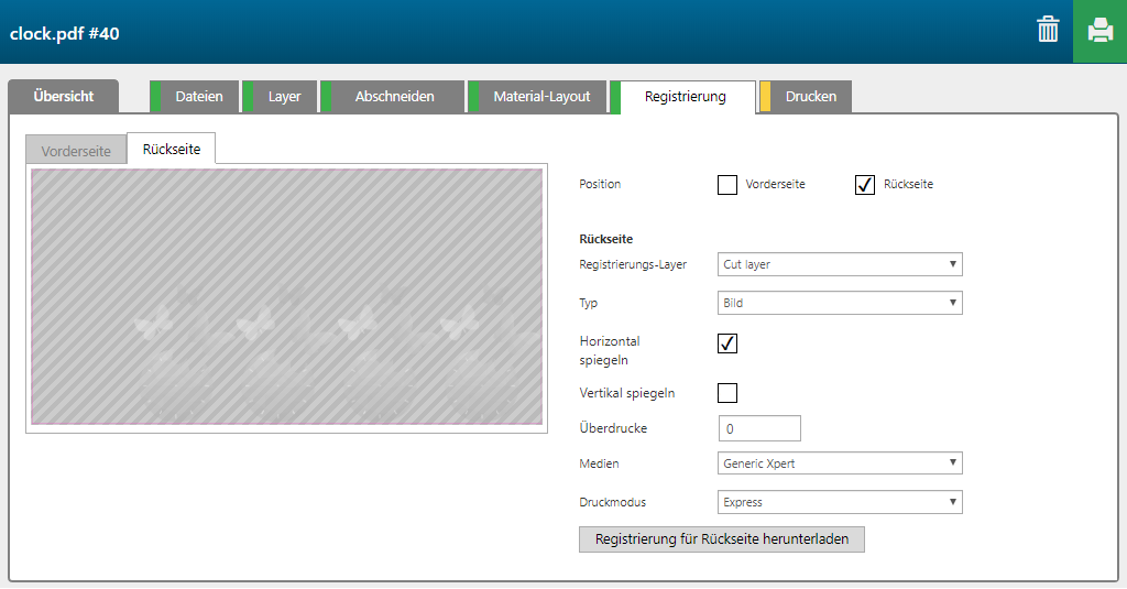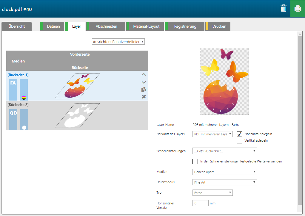 Die Rezeptur 'Print on objects' enthält 2 Layer, die auf die Rückseite des Materials gedruckt werden.