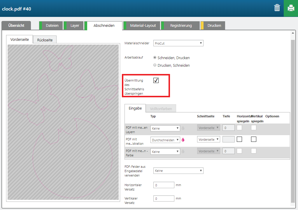 Da für dieses Anwendungsdesign vorab zugeschnittene Materialien verwendet werden, muss das Kontrollkästchen [Übermittlung des Schnittbefehls überspringen] aktiviert sein.
