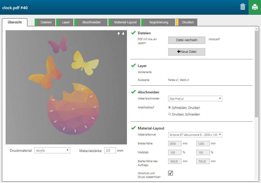 Mithilfe der Rezeptur 'Print on objects' können Sie vorher zurechtgeschnittene Objekte bedrucken.