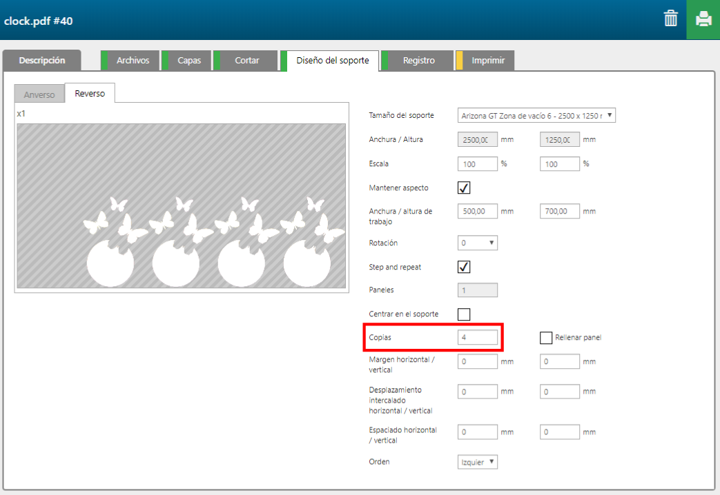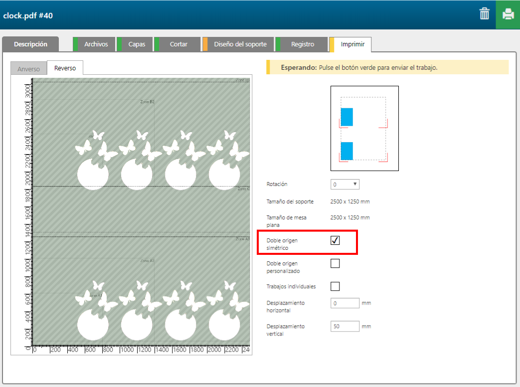 Si desea imprimir más de un panel, puede usar la opción [Doble origen simétrico]. Esta opción permite disponer los objetos en un lado de la mesa mientras se imprimen los objetos del otro lado de la mesa.