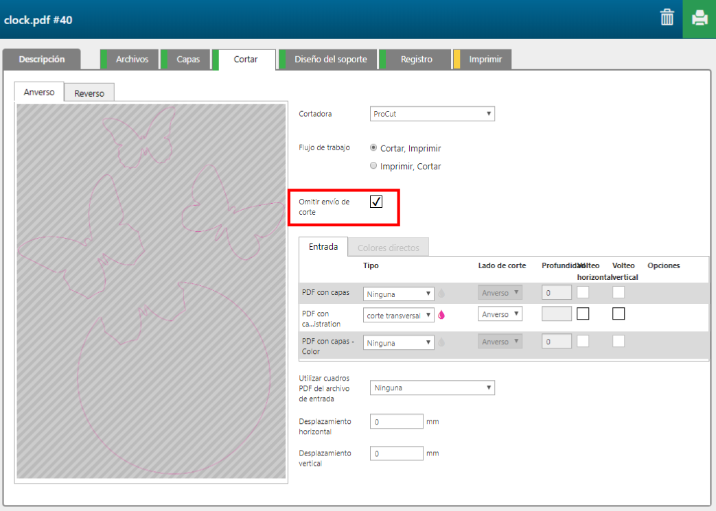 Para esta aplicación se utilizan piezas precortadas, de ahí que marquemos la casilla [Omitir envío de corte].