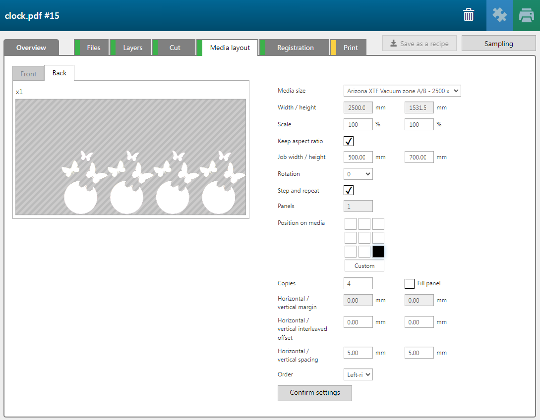 Die Rezeptur [Objekte bedrucken] enthält 2 Layer, die auf die Rückseite des Materials gedruckt werden.