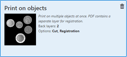 Mithilfe der Rezeptur [Objekte bedrucken] können Sie vorher zurechtgeschnittene Objekte bedrucken.