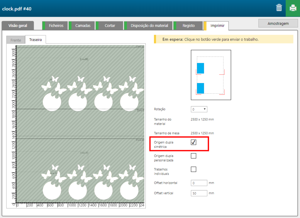 Se desejar imprimir mais do que um painel, pode usar a opção [Origem dupla simétrica]. Esta opção permite-lhe posicionar os objetos num lado da mesa enquanto os objetos no outro lado da mesa são impressos.