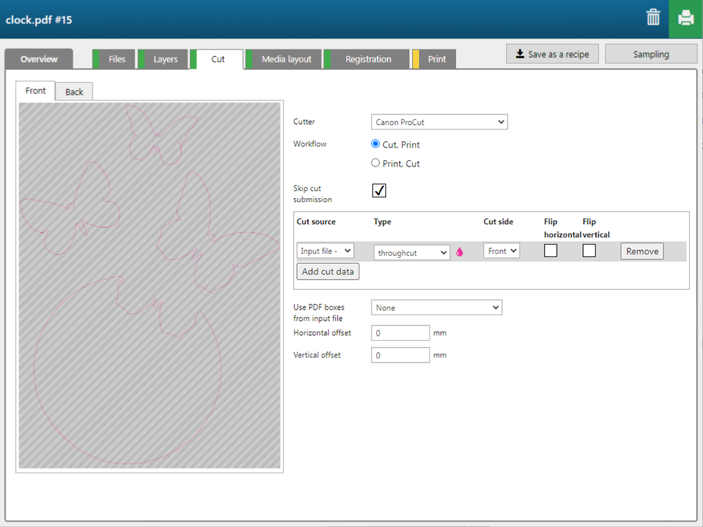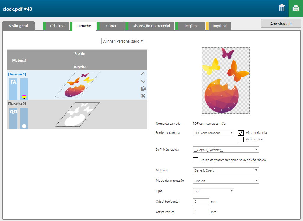 A fórmula [Imprimir em objetos] contém 2 camadas, impressas no lado traseiro do material.