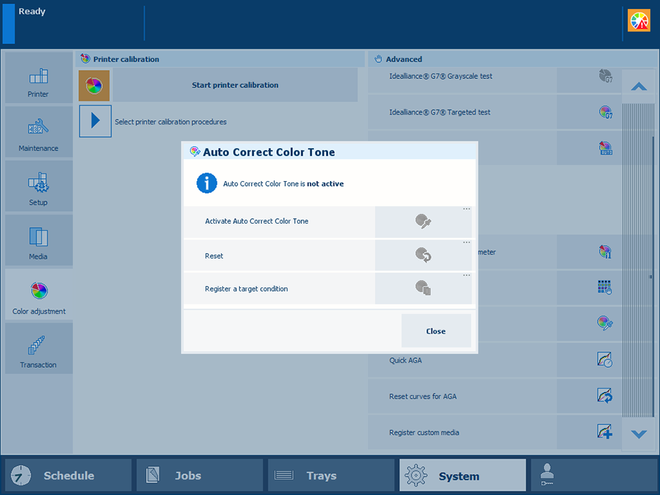 In order to enable the ACCT function in the future, you must first register these color tones as a reference. It is recommended to do the registration right after print system installation. The registration procedure uses an internal sensor to measure the color tones.