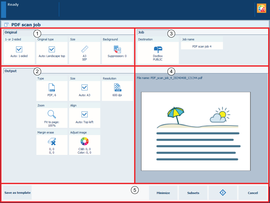 PRISMAsync automatically defines a number of settings for the originals and the scan file. However, you can overrule these automatic settings. The automatic settings have the prefix "Auto".