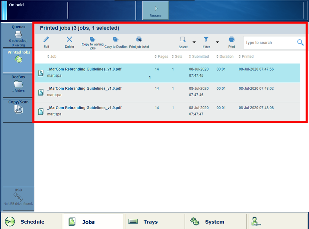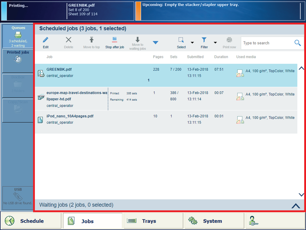 Lijst met wachtende opdrachtenDe DocBox is een opdrachtbestemming om opdrachten te verzamelen vóór het afdrukken. Met DocBox-mappen kunnen opdrachten eenvoudig worden gegroepeerd op opdrachteigenaar of afdeling. Er kunnen ook DocBox-mappen worden gebruikt voor opdrachten die moeten worden afgedrukt op basis van specifieke vereisten. De DocBox-map [Public (Openbaar)] kan door alle operators worden gebruikt.