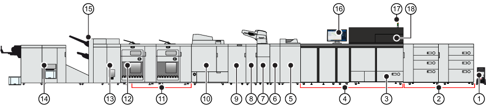 Example of a print system extended with several input and output optionals|