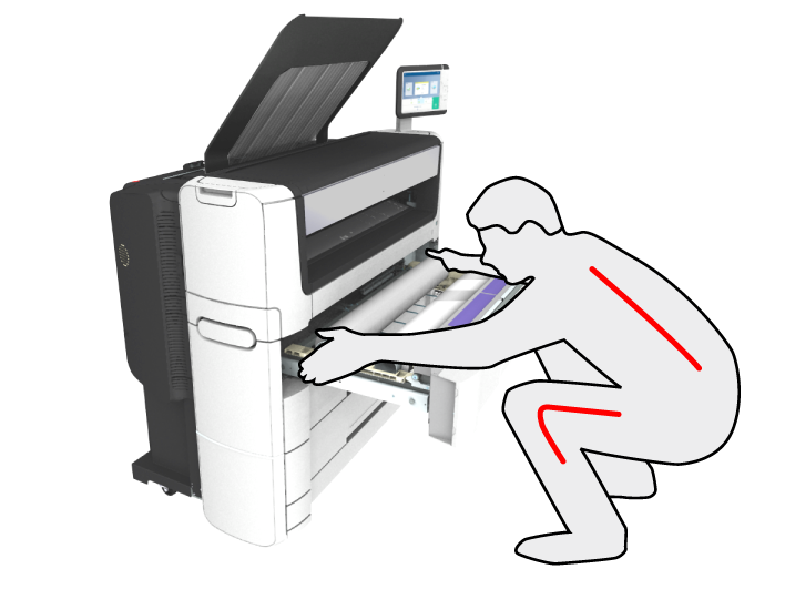 2번 위치에서 A0 용지 롤을 분리하려는 경우 아래 그림처럼 무릎을 굽혀 등에 무리가 가지 않도록 해야 합니다.