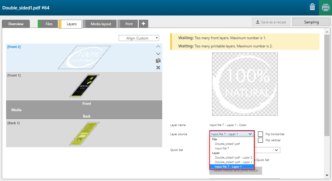 Une application pour rouleau ne peut comporter qu'un seul calque pour le recto et qu'un seul pour le verso.
