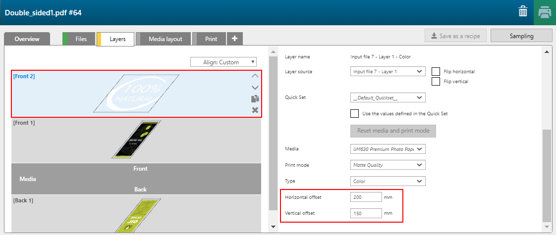 Impostare i valori di offset per l'immagine sulla parte anteriore. Guardate l'anteprima nella scheda [Panoramica] per verificare i valori di offset.
