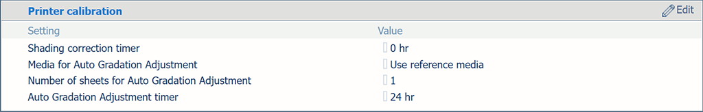 Section [Calibrage imprim.] Utilisez le paramètre [Temporisateur de la correction des dégradés] pour définir l’intervalle de temps préféré.