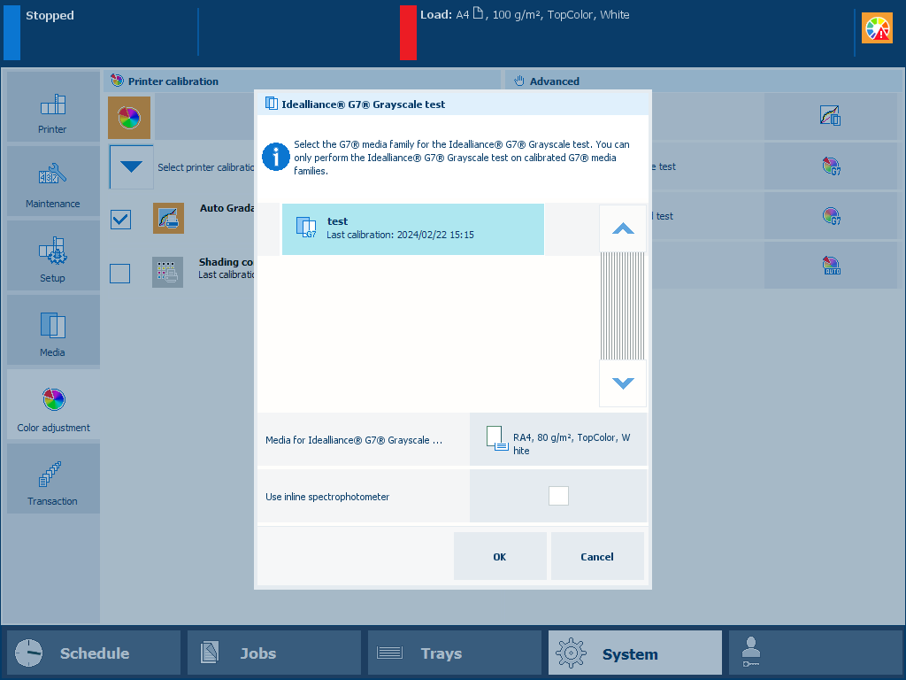 The G7® Grayscale test applies to all media of the media family. You only have to perform a G7® Grayscale test for one media of the media family. This is the media that is also used for media family calibration. Make sure you use that same media each time you perform a G7® Grayscale test.