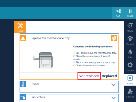 当您打开维护盒时,操作面板将显示消息说明您必须更换维护盒。 如果您是意外执行此操作,并且您不需要更换维护盒,则可以取消更换。