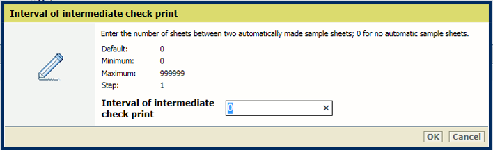 Используйте параметр [Интервал промежуточной проверки печати], чтобы задать интервал промежуточных проверок печати. Печать отпечатков промежуточной проверки печати выключена, если используется значение 0.