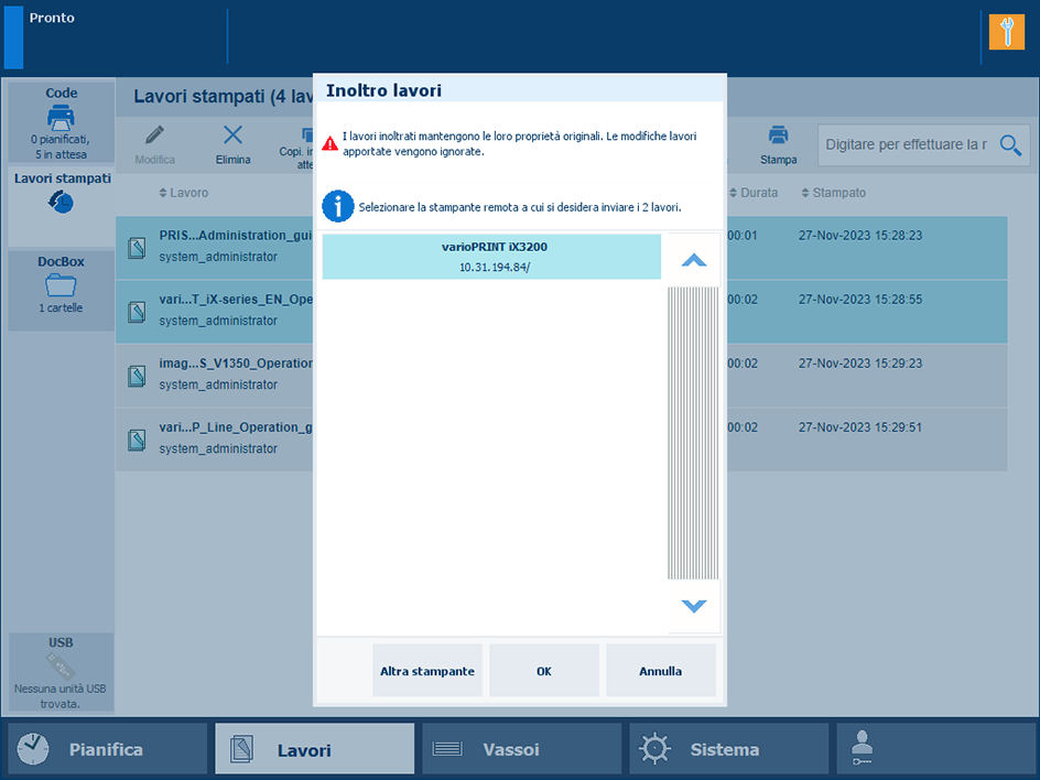 L'amministratore di sistema può configurare la funzione di inoltro e l'elenco di altre stampanti in Settings Editor. Ubicazione: . La funzione di inoltro mostra anche le stampanti gestite con PRISMAremote Manager / PRISMAsync Remote Manager Classic.