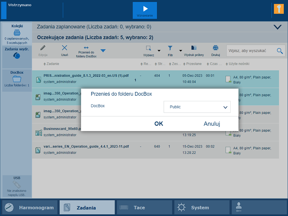 Przenoszenie zadania oczekującego do folderu DocBoxDo folderu DocBox można przenosić zadania z następujących lokalizacji: