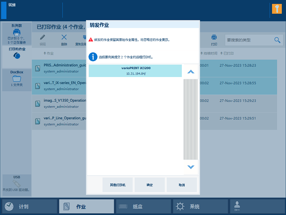 打印作业的目标位置在提交作业时即确定。但是,您可以决定将作业移动到另一个目标位置,因为您想稍后再打印作业或想要存储作业。您还可以决定存储或重新打印已打印的作业。