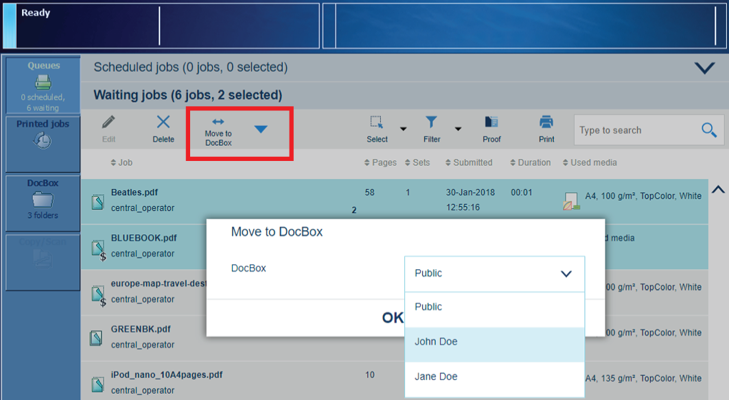 Déplacer le travail en attente vers DocBoxVous pouvez déplacer des travaux vers un dossier DocBox à partir des emplacements suivants :