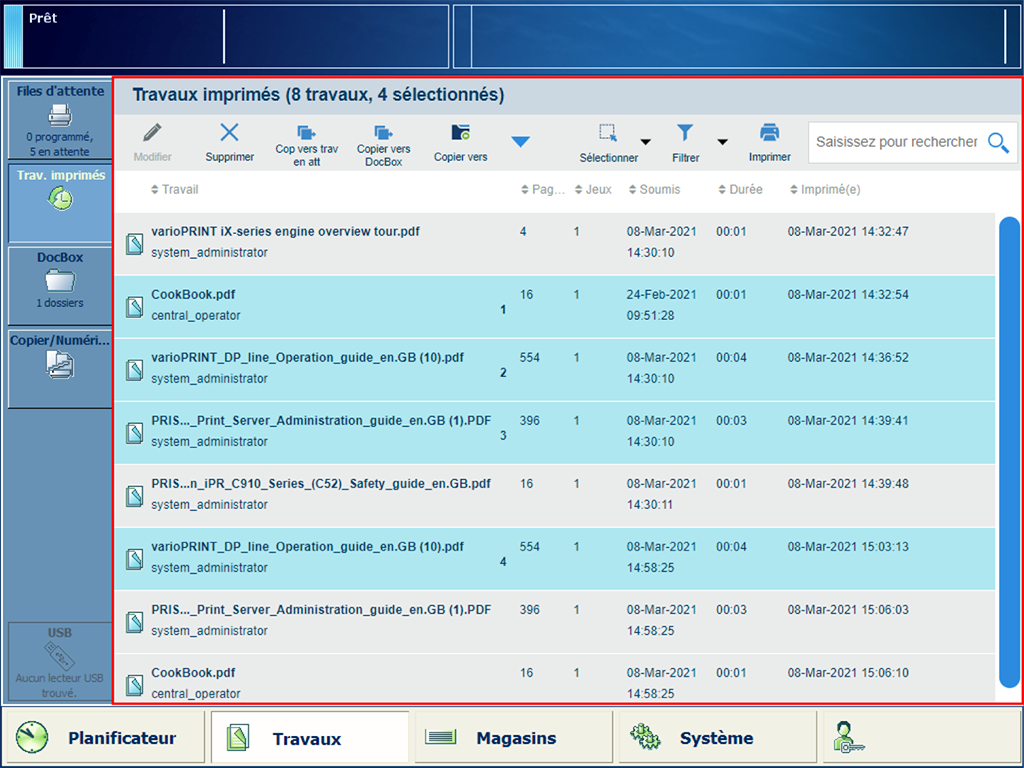 Copiez un travail sélectionné et déplacez la copie vers un dossier DocBox ou la liste des travaux en attente.
