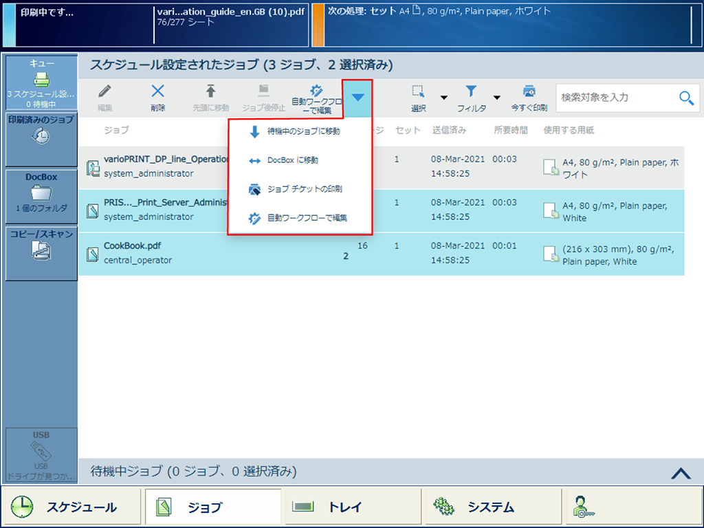 待機中のジョブを DocBox に移動する次の場所からジョブを DocBox フォルダに移動できます。