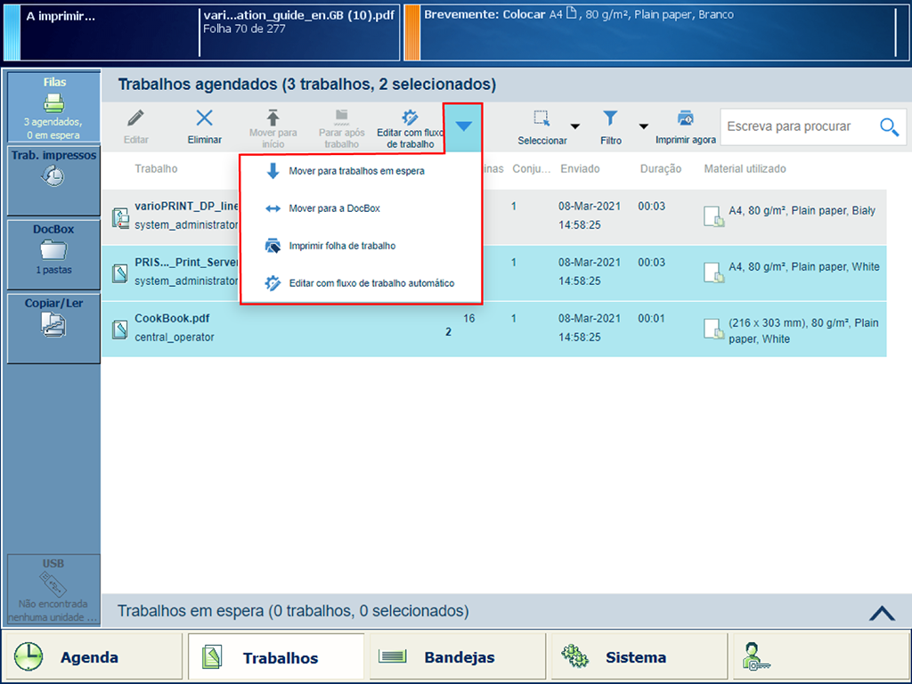 Crie uma cópia de um trabalho selecionado e mova a cópia para uma pasta DocBox ou para a lista de trabalhos em espera.