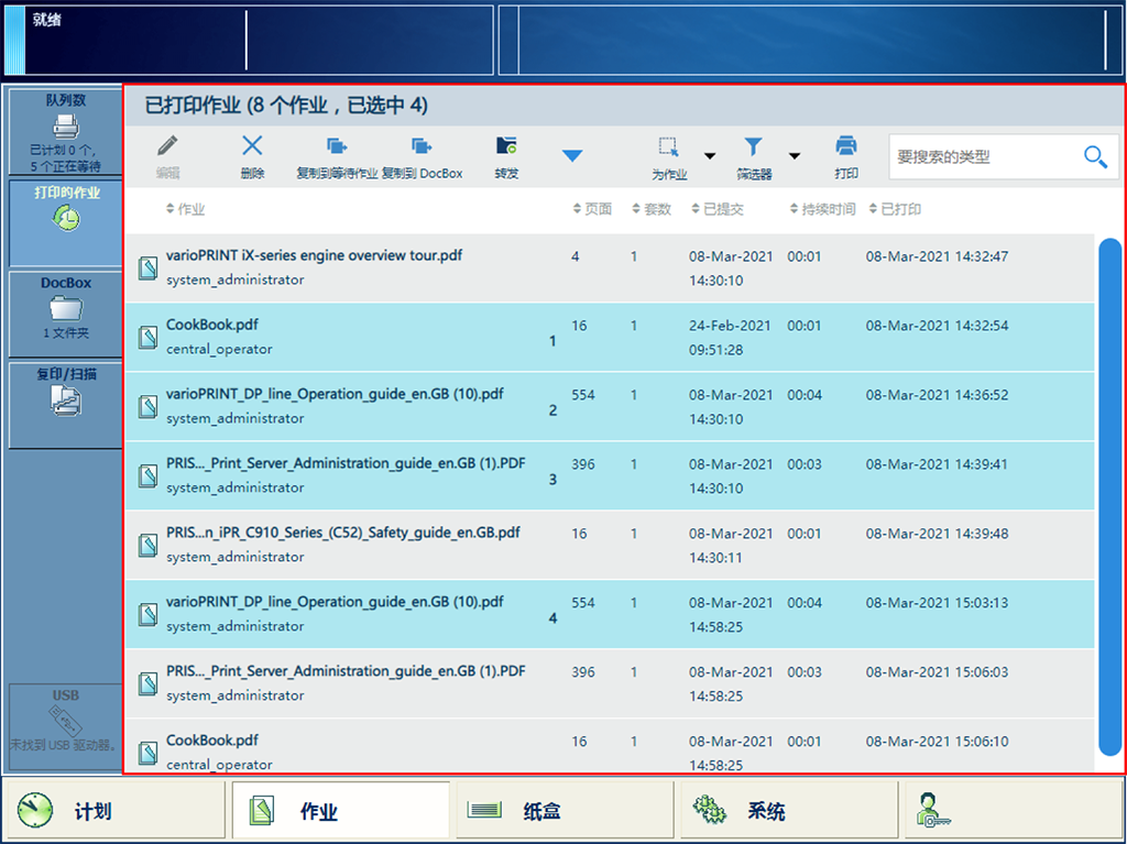 将打印的作业复制到 DocBox 或等待作业列表您可以从以下位置复制并移动已打印作业: