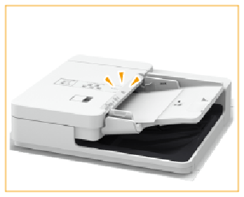 Na tacy na oryginały umieść oryginalne dokumenty stroną zadrukowaną do góry. Wskaźnik podajnika oryginałów* zacznie świecić na zielono. Pozycja oryginałów wpływa na lokalizację zszycia, składania i dziurkowania. Nie należy wkładać rąk w szczelinę tacy na oryginały. Może to doprowadzić do obrażeń ciała. |