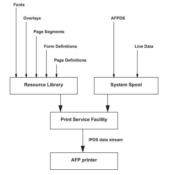 In the figure below, the basic components of AFP printing are depicted. The right side of the figure shows the most common used data streams processed by AFP. The left side of the figure shows the five types of resources. The data stream and resources are processed by the Print Service Facility (PSF).