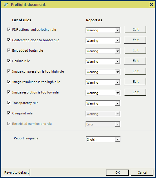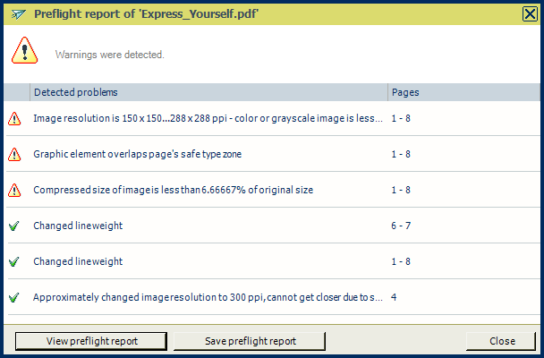 Click [OK] to start the preflight check. The preflight report is generated. The green ticks indicate the preflight engine solved the problem, the exclamation symbols indicate a warning.