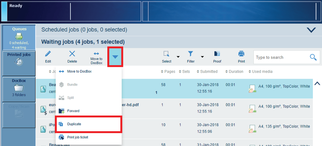 Når du vil bruke ulike utskriftsinnstillinger for samme kildedokument, kan du kopiere én eller flere ventende jobber eller DocBox-jobber.