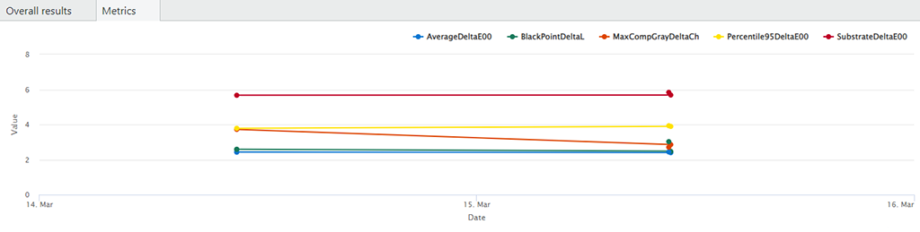 Na vista [Métricas], pode ver informações mais detalhadas numa métrica específica. Para ver o grafo de métricas, é necessário selecionar pelo menos um teste para o qual pretende ver os dados.