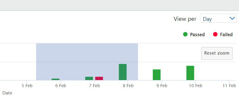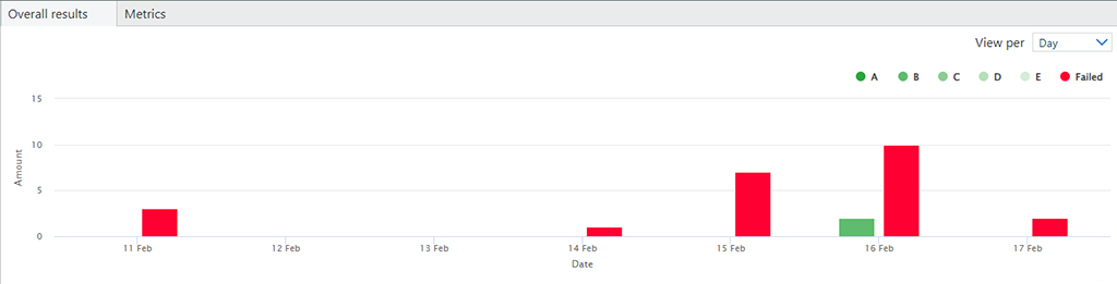 [Resultados globais] visto por diaA vista [Resultados globais] mostra os resultados da validação ao longo de um determinado período. Os resultados podem ser vistos por dia, semana, mês ou ano. Também é possível ver os testes que atingiram um nível de qualidade específico.