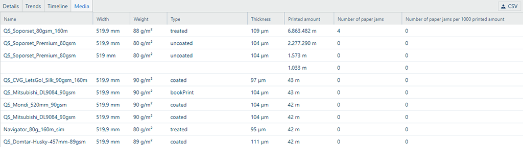 Pohled na [Média] tiskárnu s průběžným podáváním, když jsou vybrány metrické jednotkyPřehled použitých médií pro vybrané zařízení můžete exportovat v aplikaci [Zařízení] jako soubor CSV. Chcete-li exportovat data, klikněte