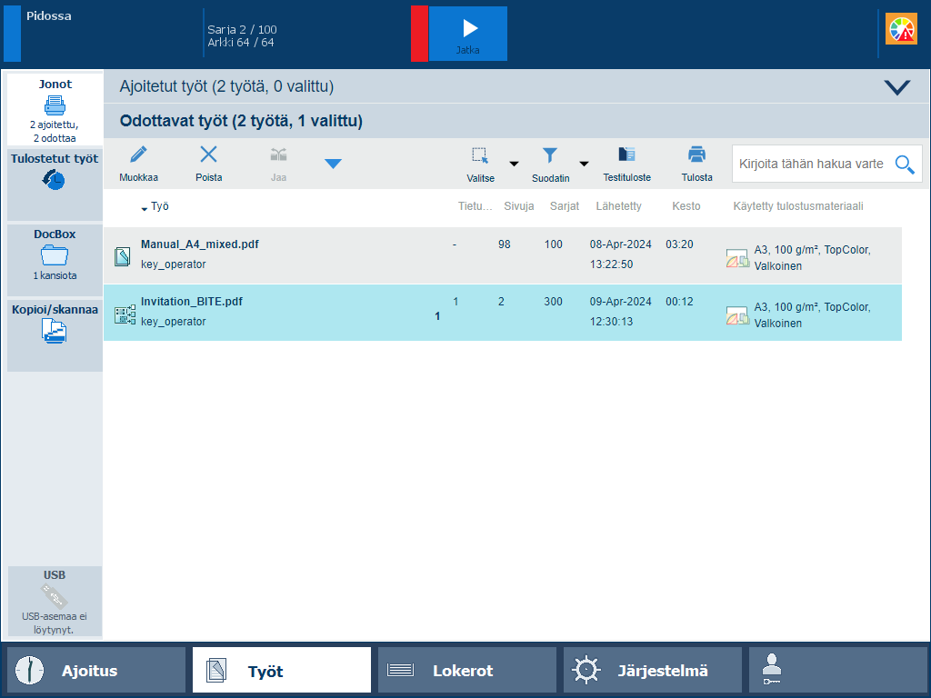 Kun PDF/VT-työ saapuu tulostusjonoon, voit suorittaa seuraavat toiminnot:
