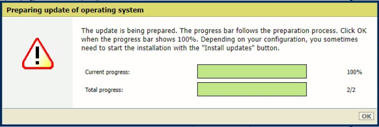 Нажмите [OK], когда индикатор хода выполнения покажет 100%. В зависимости от вашей конфигурации система автоматически запускает установку или вам следует самостоятельно запустить установку с помощью кнопки [Установка обновлений].