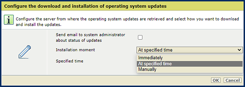 При выборе [Вручную] в настройках [Время установки] вы получаете электронное письмо, когда обновления операционной системы становятся доступными для установки и когда необходимо перезагрузить систему для завершения установки.