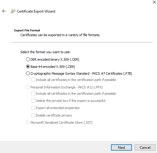 Klikněte na tlačítko [Next] a vyberte možnost [Base-64 encoded X.509 (.CER)].