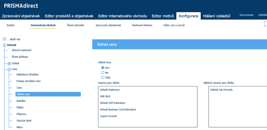 Možnost [Odhad ceny] není dostupná v internetovém obchodu. Zákazníkovi není nikdy předložen odhad nákladů na úlohu.