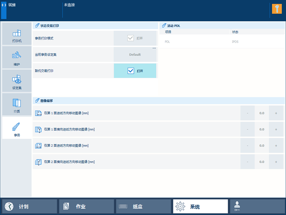 可变数据对齐不正确时,您可以通过控制面板或交易打印设置(预设定义的图像移位)调整图像移位。图像移位在所有纸盒的全部打印输出中都可能出现。